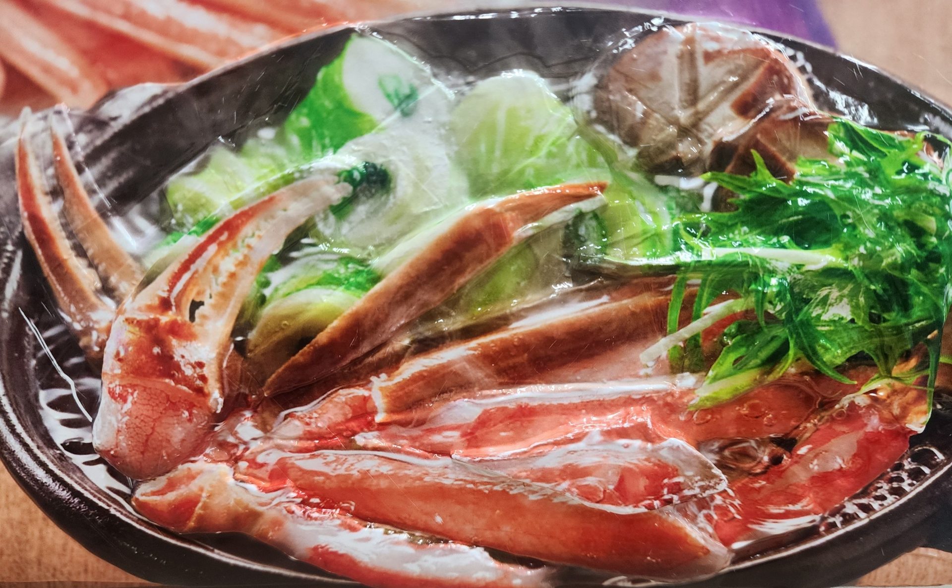 写真のカニ鍋は、鮮やかな紅色のカニと、シャキシャキとした緑の野菜のコントラストが抜群です。