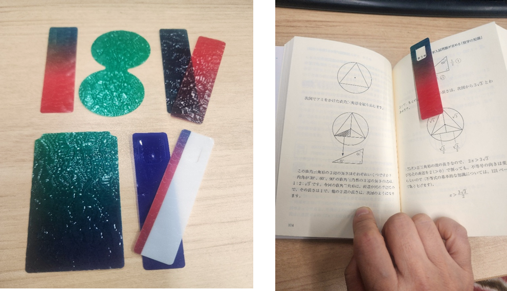 今回は「本が好き」というテーマからブックマークを製作しましたが、成型加工の技術は、アクセサリーなど