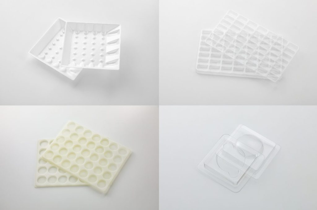 真空成型で生産される「真空成型トレー」は、電子部品用/精密機器用/注射器用/車載部品用/食品用などあらゆるジャンルの包装容器やトレーとして使用されています。